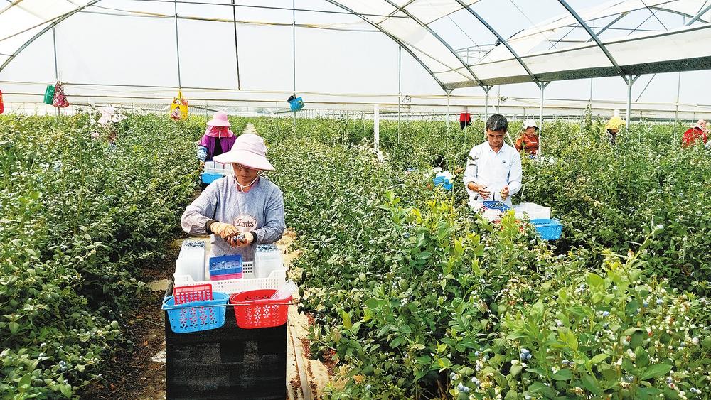 “以前在外省加班加點干,一個月工資4000元左右,自己還要承擔(dān)房租、吃飯等開銷?;氐皆颇?,在藍莓產(chǎn)季,我一天可以采摘300多盒藍莓,月收入大概是4500元,公司還貼心地為我們提供了食宿。”周葉芬一邊采摘藍莓一邊笑著說。發(fā)現(xiàn)這份好工作后,她不僅把父母、丈夫、孩子帶到了蒙自,還帶動了50多個老家的“孃孃”成為采摘工,共同致富。