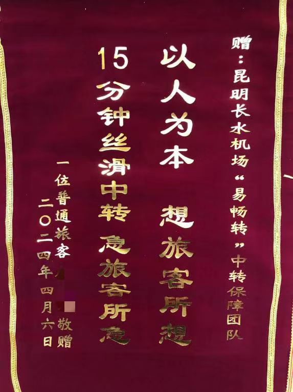 昆明信息港訊 記者上官艷君 “以人為本 想旅客所想 急旅客所急”“熱情體貼 溫柔善良……”近日,昆明機場中轉(zhuǎn)保障團隊收到了一份郵寄來的特別禮物——兩面紅底金字的錦旗以及感謝信。