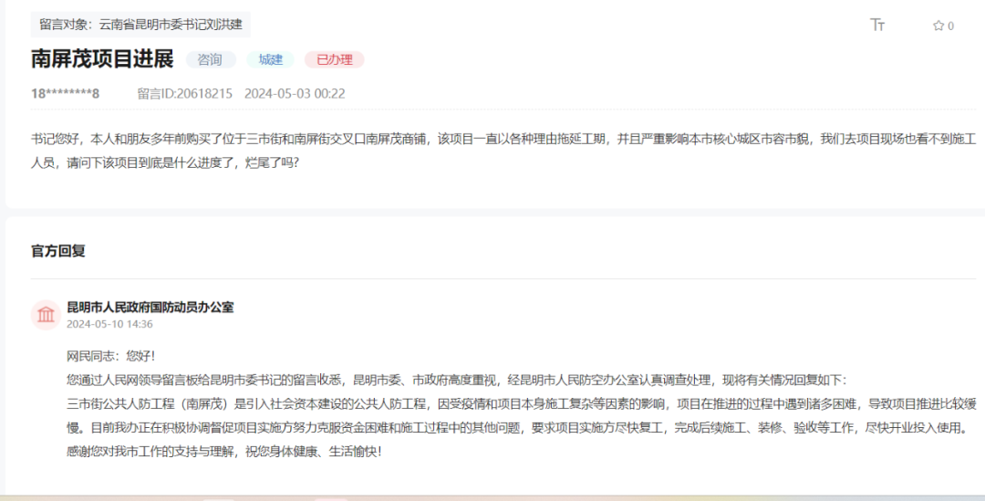 5月10日,根據(jù)昆明市人民政府國防動員辦公室回復,三市街公共人防工程(南屏茂)是引入社會資本建設的公共人防工程,因受疫情和項目本身施工復雜等因素的影響,項目在推進的過程中遇到諸多困難,導致項目推進比較緩慢。