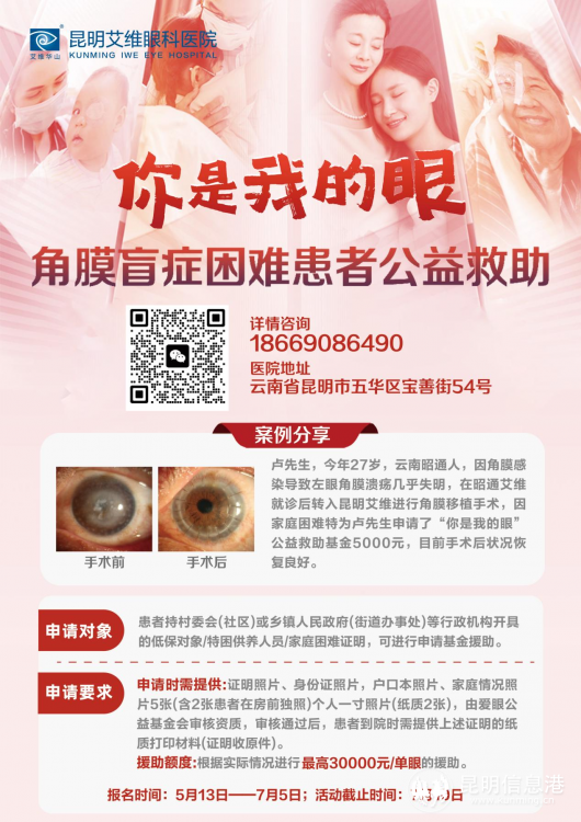 目前,該公益計(jì)劃面向云南地區(qū)招募角膜盲癥困難患者,符合條件的患者持相應(yīng)的困難證明可申請(qǐng)?jiān)?。援助額度根據(jù)實(shí)際情況核批,最高金額30000元/單眼。此次活動(dòng)報(bào)名截止時(shí)間為2024年7月5日,有意者可盡快到昆明艾維眼科醫(yī)院報(bào)名。
