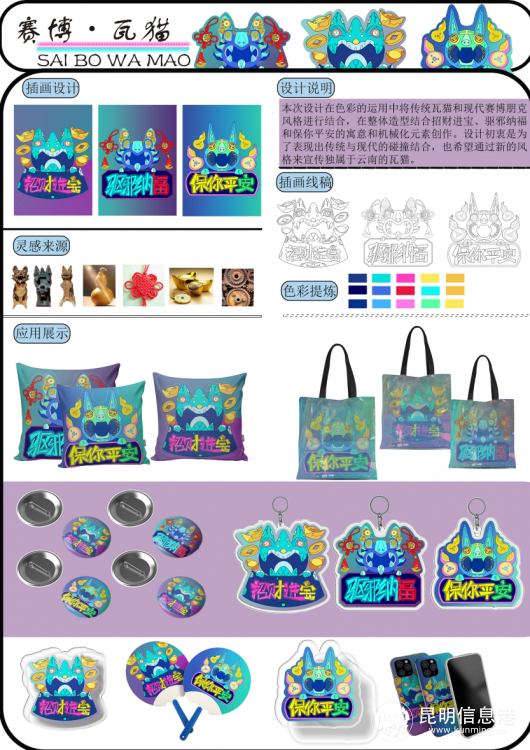 創(chuàng)作者們圍繞呈貢代表性傳統(tǒng)文化元素進(jìn)行創(chuàng)作,云南民族大學(xué)學(xué)生刀啟麗的賽博瓦貓,創(chuàng)作出抱枕、帆布包、鑰匙扣、手機(jī)殼等產(chǎn)品,從各角度展現(xiàn)瓦貓IP的產(chǎn)品成果轉(zhuǎn)化。在色彩的運(yùn)用中將傳統(tǒng)瓦貓和現(xiàn)代賽博朋克風(fēng)格進(jìn)行結(jié)合,在整體造型結(jié)合“招財(cái)進(jìn)寶”、“驅(qū)邪納?!焙汀氨D闫桨病钡脑⒁夂蜋C(jī)械化元素創(chuàng)作,創(chuàng)新風(fēng)格來(lái)宣傳瓦貓。