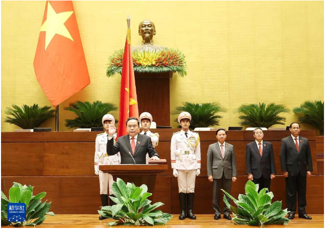5月20日,陳青敏(前)在越南首都河內(nèi)宣誓就任越南國(guó)會(huì)主席。新華社/越通社