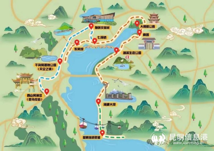 線路途經(jīng)主要景點有昆明旅游索道、海埂大壩、湖濱生態(tài)濕地公園、庾園、大觀樓公園、融創(chuàng)文旅城、東風壩、七浮橋、干溝尾濕地公園(天空之鏡)。