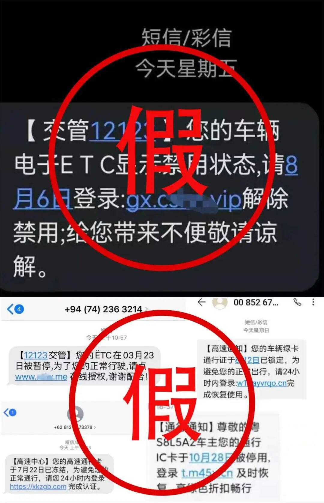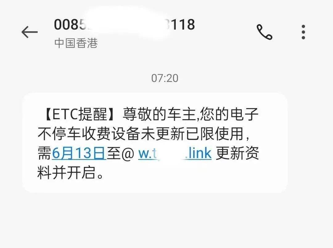 詐騙分子以ETC中心、高速管理中心等機(jī)構(gòu)名義發(fā)送短信,以受害人的ETC無法繼續(xù)使用,想要恢復(fù)使用就要重新認(rèn)證的借口進(jìn)行詐騙。
