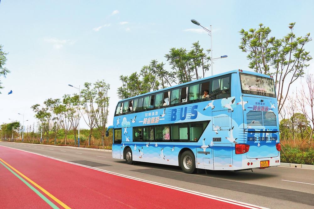 近日,昆明滇池黃金岸線旅游巴士開行。4.2米的雙層旅游巴士設(shè)置了主題車廂,運(yùn)行速度為每小時(shí)25公里,路線途經(jīng)滇池綠道、海埂大壩、大觀公園、東風(fēng)壩等景點(diǎn),便于游客觀賞沿途風(fēng)景。(云南日報(bào) 記者陳飛 實(shí)習(xí)生門世輝 攝)