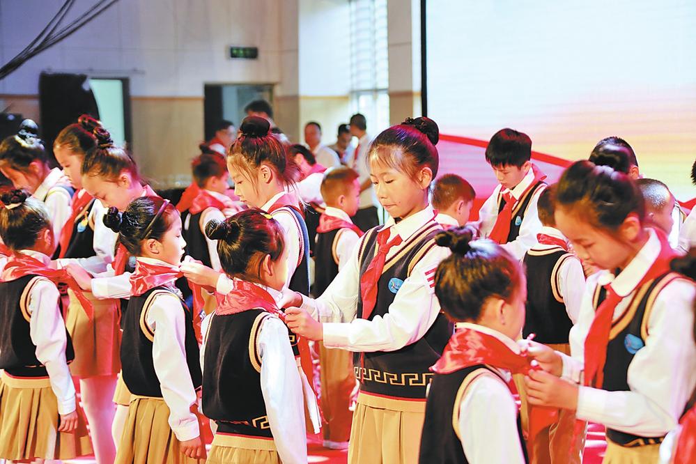 在主題隊(duì)日活動(dòng)上,盤龍區(qū)對(duì)2023年少先隊(duì)集體和優(yōu)秀個(gè)人進(jìn)行了表揚(yáng)。在少先隊(duì)新隊(duì)員代表集中入隊(duì)儀式上,老隊(duì)員為新隊(duì)員佩戴紅領(lǐng)巾,傳遞責(zé)任和使命。(云南日?qǐng)?bào) 記者王瓊梅 通訊員張曉燕)