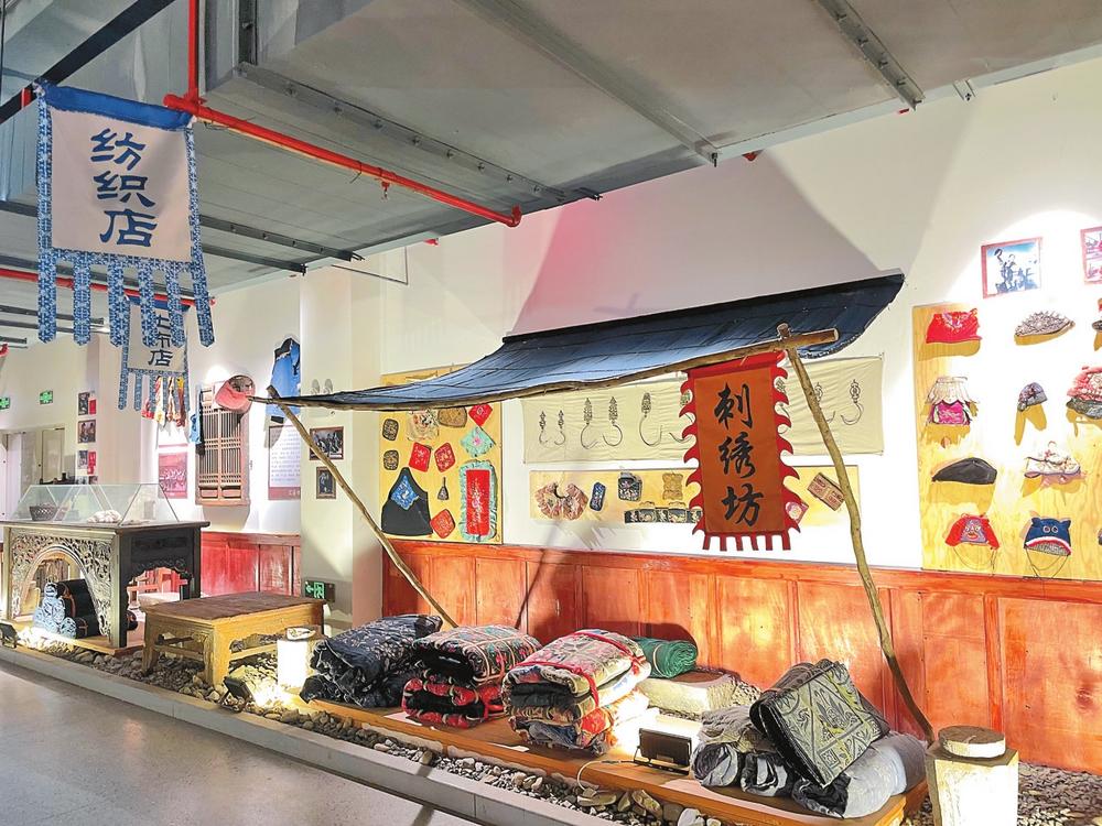 沿著玉溪市大營街幸福小鎮(zhèn)農(nóng)貿(mào)市場的臺階拾級而上,承載著大營街街道幾代人生活記憶的匯溪記憶展覽館映入眼簾。踏入展覽館,舊時的街景錯落有致,行走間來到紡織染繡展區(qū),仿佛穿過時光隧道來到20世紀初的玉溪,彼時的街頭,小販的吆喝聲和運送貨物的馬蹄聲縈繞耳畔,行人來來往往絡繹不絕,一段輝煌繁榮的紡織業(yè)貿(mào)易歷史浮現(xiàn)眼前。