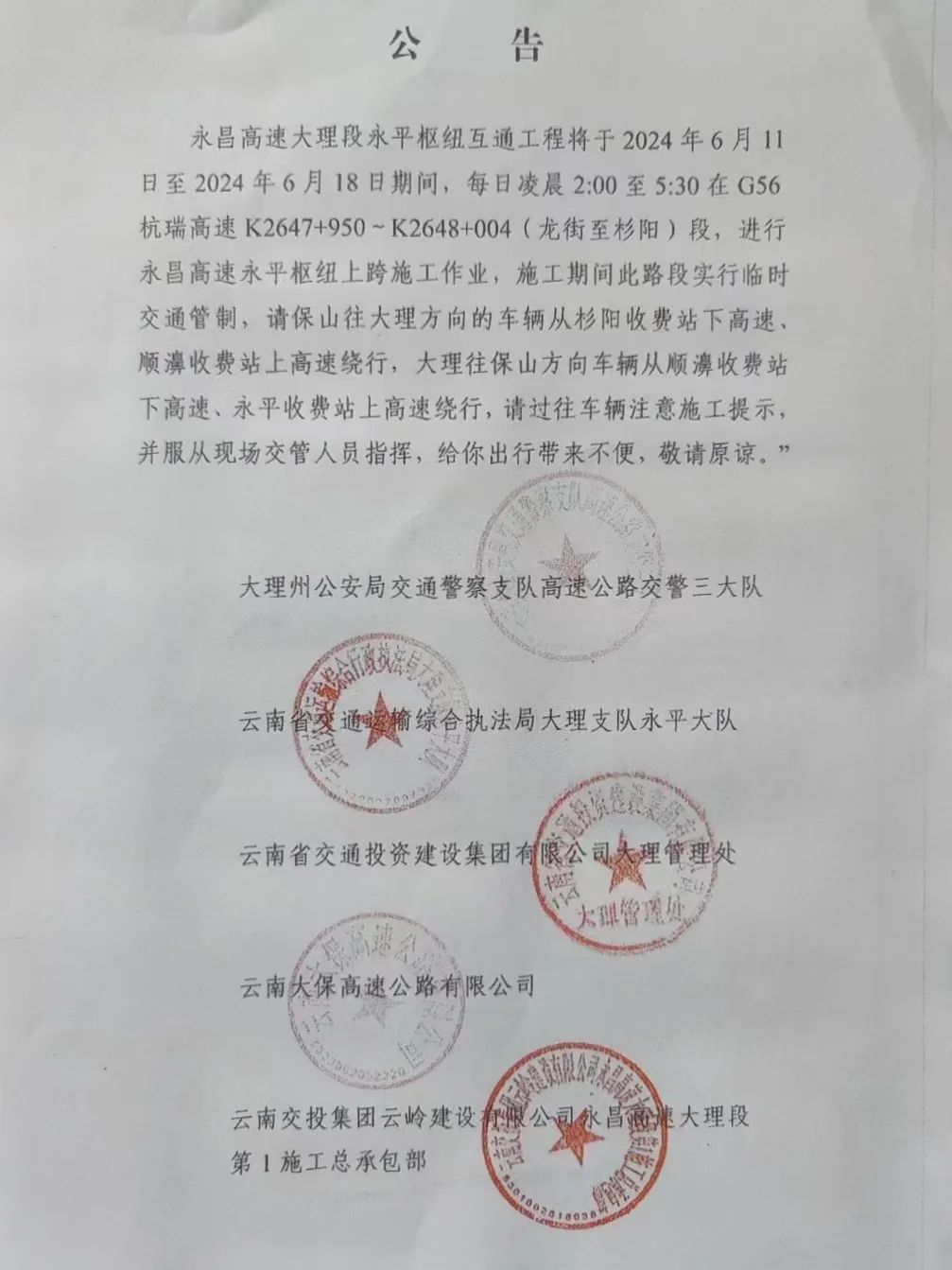 永昌高速大理段永平樞紐互通工程于2024年6月11日至2024年6月18日期間,每日凌晨2:00至5:30在G56杭瑞高速K2647+950~K2648+004(龍街至杉陽(yáng))段,進(jìn)行永昌高速永平樞紐上跨施工作業(yè),施工期間此路段實(shí)行臨時(shí)交通管制,屆時(shí)請(qǐng)保山往大理方向的車(chē)輛從杉陽(yáng)收費(fèi)站下高速、順濞收費(fèi)站上高速繞行,大理往保山方向的車(chē)輛從順濞收費(fèi)站下高速、永平收費(fèi)站上高速繞行,請(qǐng)過(guò)往車(chē)輛注意施工提示,并服從現(xiàn)場(chǎng)交管人員指揮,給你出行帶來(lái)不便,敬請(qǐng)?jiān)彙?/p>