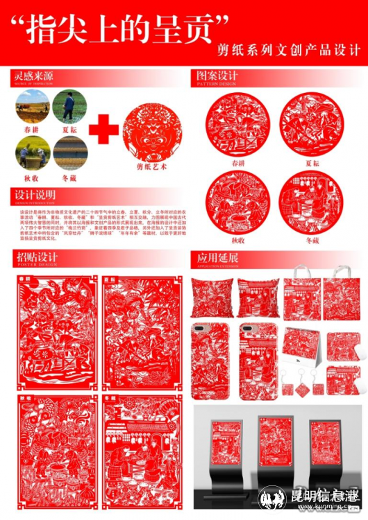 參賽者將二十四節(jié)氣中的立春、立夏、秋分、立冬所對(duì)應(yīng)的農(nóng)事活動(dòng)“春耕、夏耘、秋收、冬藏”和“呈貢剪紙藝術(shù)”相結(jié)合,力圖展現(xiàn)中國(guó)古代兩項(xiàng)偉大智慧的同時(shí),將其以海報(bào)和文創(chuàng)產(chǎn)品的形式展現(xiàn)出來,在海報(bào)的設(shè)計(jì)中還加入了四個(gè)季節(jié)所對(duì)應(yīng)的“梅蘭竹菊”,象征著四季及君子品格,另外還加入了呈貢裝飾剪紙藝術(shù)中所包含的“鳳穿牡丹”“獅子滾繡球”“年年有余”等題材,致力于更好地宣揚(yáng)呈貢剪紙非遺文化。