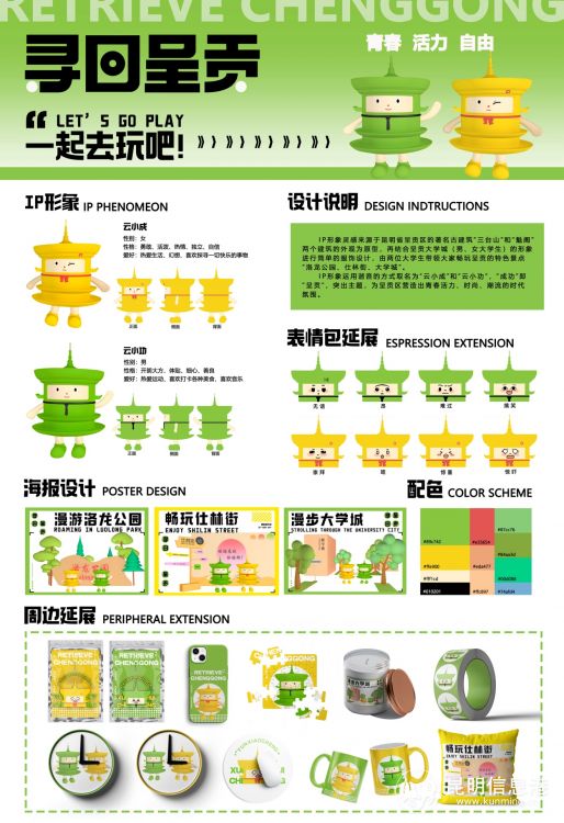參賽者以當(dāng)?shù)刂墓沤ㄖ叭_(tái)山”和“魁閣”建筑外形為IP形象基本原型,將建筑擬人化,再結(jié)合當(dāng)?shù)卮髮W(xué)城學(xué)生的形象進(jìn)行設(shè)計(jì)。采用諧音的方式將IP形象取名為“云小成”和“云小功”,”成功“即”呈貢“,寓意呈貢將發(fā)展得越來越好。配色主要采用綠色和黃色,突顯大學(xué)生的青春活力,在兩位大學(xué)生的帶領(lǐng)下讓我們暢玩呈貢特色景點(diǎn)”洛龍公園“、”仕林街“、”大學(xué)城“,為呈貢區(qū)營(yíng)造青春活力、時(shí)尚、潮流的時(shí)代氛圍。該設(shè)計(jì)為IP形象設(shè)計(jì),可作為標(biāo)識(shí)廣泛運(yùn)用。如:景點(diǎn)導(dǎo)視、文創(chuàng)產(chǎn)品、打卡點(diǎn)等。