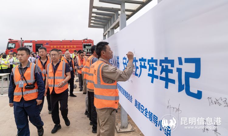 民航云南監(jiān)管局、云南航產(chǎn)投集團(tuán)、民用機(jī)場(chǎng)公安局,以及昆明機(jī)場(chǎng)相關(guān)領(lǐng)導(dǎo),共同參加了“流金揭幕”儀式,象征著昆明機(jī)場(chǎng)對(duì)安全生產(chǎn)的堅(jiān)定承諾?,F(xiàn)場(chǎng),隨著金色沙幕緩緩散開,“人人講安全,個(gè)個(gè)會(huì)應(yīng)急,暢通生命通道”的字樣展現(xiàn)在眾人面前,代表著昆明機(jī)場(chǎng)向全社會(huì)公開承諾堅(jiān)守安全底線,確保每一步操作都符合最高安全標(biāo)準(zhǔn)。緊隨其后是一場(chǎng)別開生面的“安全承諾書”簽署活動(dòng),各單位領(lǐng)導(dǎo)和員工代表紛紛在定制的承諾書上簽名,承諾將安全生產(chǎn)理念融入日常工作的每一個(gè)細(xì)節(jié),形成了一道亮麗的安全文化風(fēng)景線。