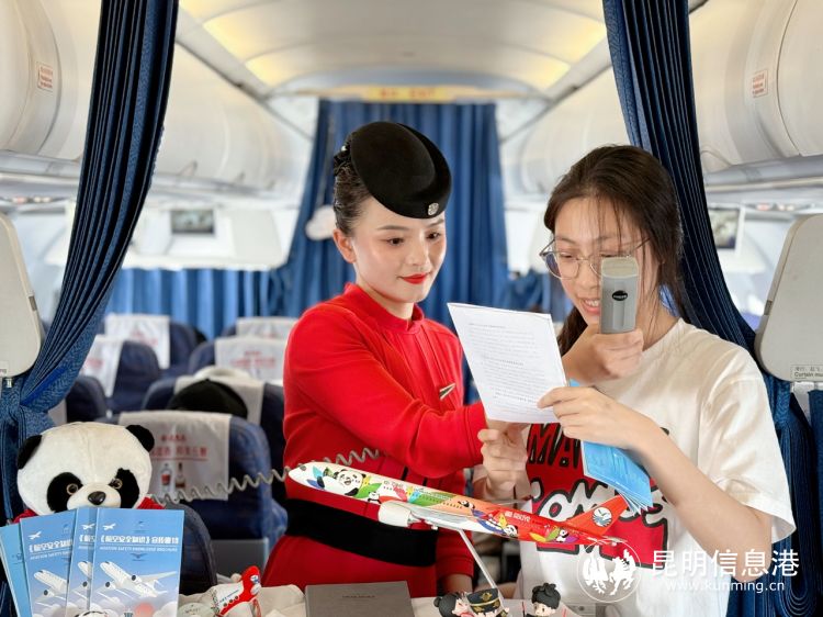 當(dāng)天,在3U8250廈門-昆明航班上,乘務(wù)員向旅客分發(fā)了《航空安全知識(shí)》宣傳冊(cè),讓旅客了解基本航空知識(shí)和相關(guān)規(guī)定,將安全意識(shí)融入每一趟旅程。在“課堂”里,乘務(wù)員通過廣播播報(bào)和現(xiàn)場(chǎng)演示,向旅客普及飛機(jī)安全知識(shí)和應(yīng)急設(shè)備使用方法。