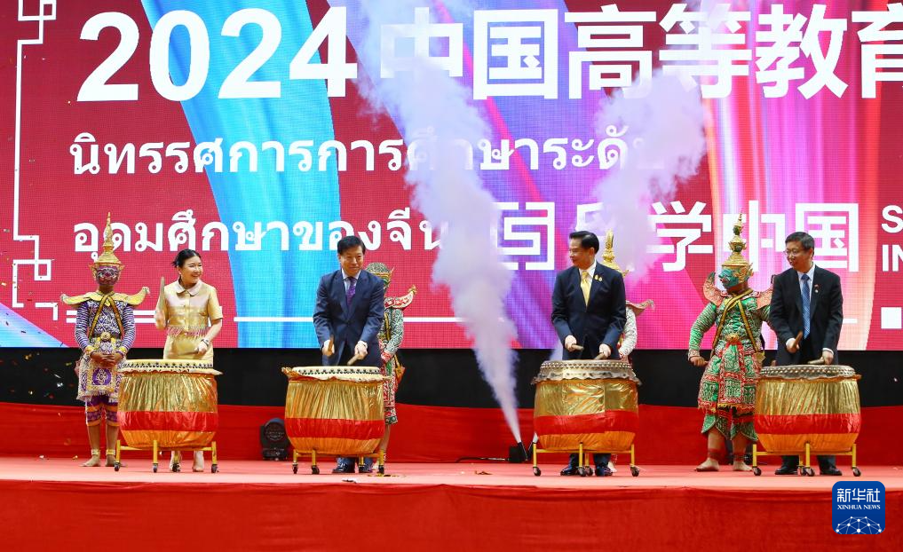 6月22日,嘉賓在泰國曼谷吞武里大學(xué)為中國高等教育展擊鼓開幕。2024中國高等教育展22日在泰國曼谷吞武里大學(xué)舉辦,來自中國的32所高校參展,吸引眾多泰國師生前來咨詢交流。