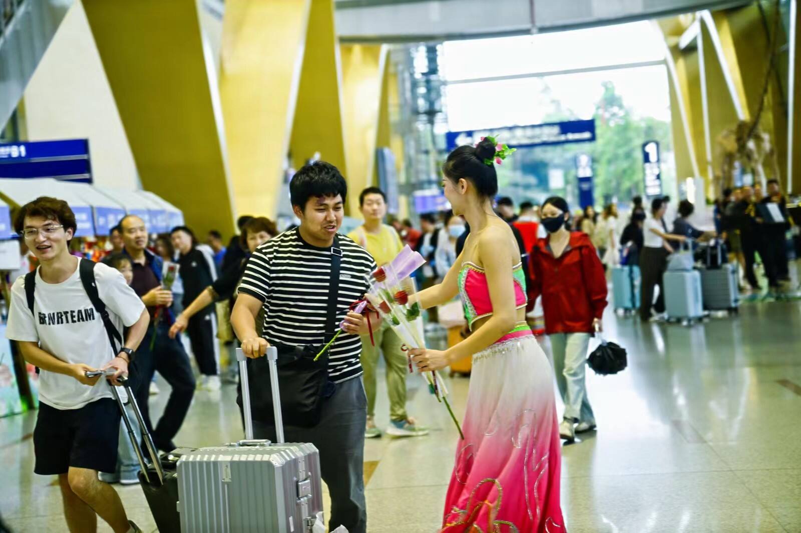 在長水機(jī)場到達(dá)大廳,昆明文創(chuàng)集市、《買買傘》舞蹈表演、聶耳交響樂團(tuán)演奏,也讓旅客們驚喜連連。“從38℃到了19℃的昆明,一下子就涼爽了,而且有很多驚喜,真是讓我感到意外?!睖刂萦慰椭芟壬跈C(jī)場收到松茸餅干和昆明黃金旅游線路手冊后,直呼“昆明寵客”。