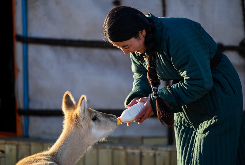 內(nèi)蒙古錫林郭勒盟蘇尼特左旗的蒙古族牧民烏伊汗給小黃羊“蹦潑來”喂牛奶(2022年1月13日攝)。新華社記者 連振 攝