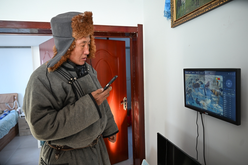 內(nèi)蒙古呼倫貝爾市陳巴爾虎旗的牧民額爾敦達來在家中通過監(jiān)控查看牲畜情況(2023年12月16日攝)。新華社記者 貝赫 攝