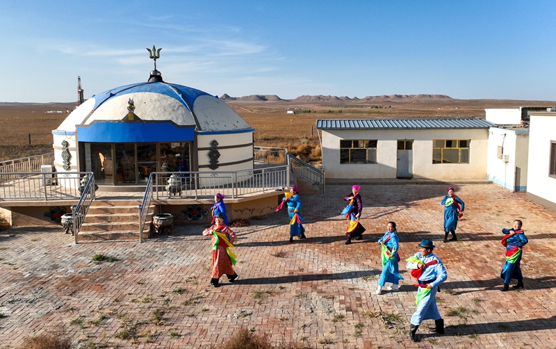 樂隊成員在內(nèi)蒙古鄂爾多斯市鄂托克旗牧民道爾吉的蒙古包前跳舞(2023年10月16日攝,無人機照片)。新華社記者 貝赫 攝
