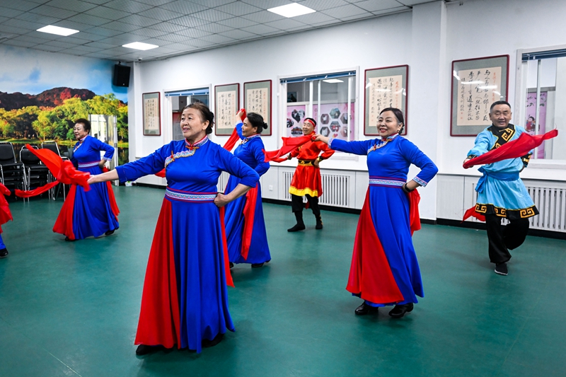 居民在內(nèi)蒙古赤峰市松山區(qū)臨潢家園社區(qū)文體活動大廳跳舞(2024年6月19日攝)。新華社記者 李志鵬 攝