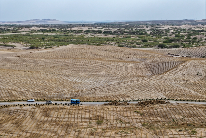 在內(nèi)蒙古赤峰市翁牛特旗其白線防沙治沙項目區(qū),穿沙公路將沙地切割,沙丘被逐步固定(2024年5月16日攝,無人機照片)。新華社記者 連振 攝