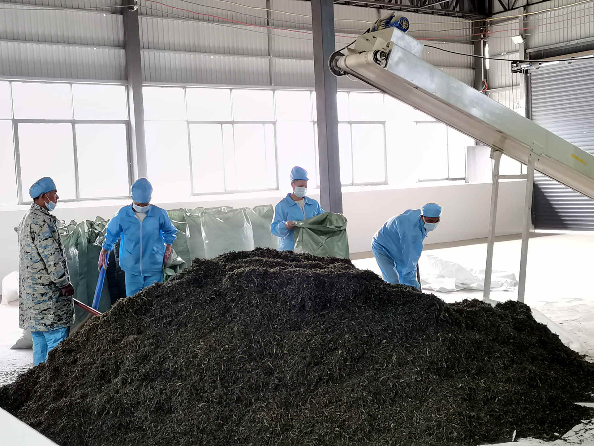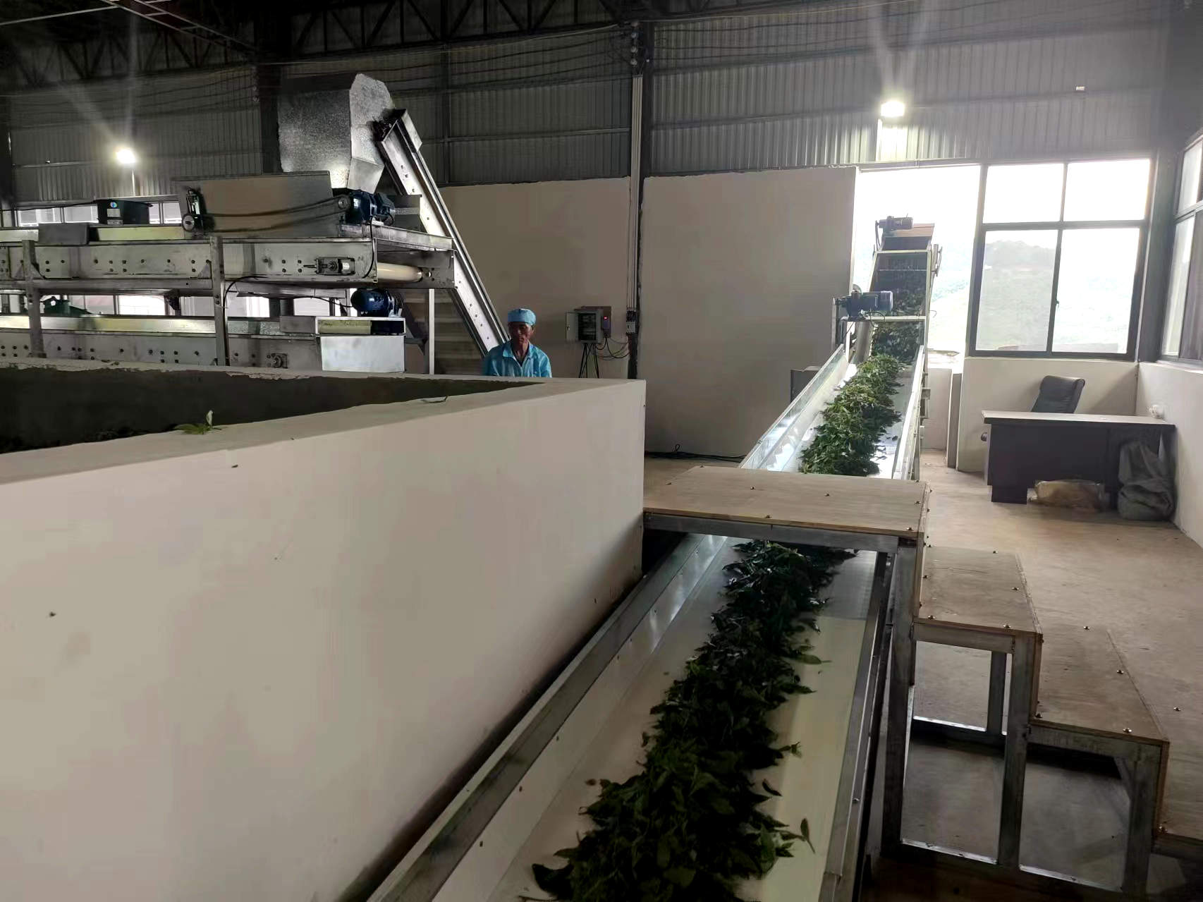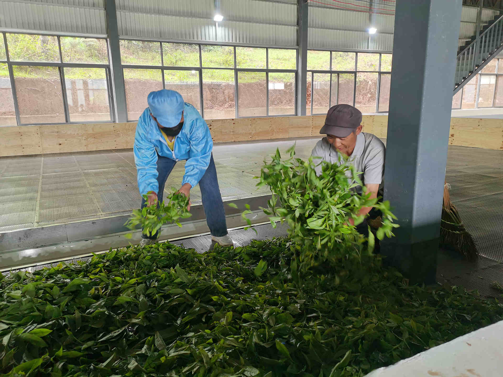 在附近的茶葉加工廠里,茶農(nóng)們正在依次排隊(duì)、稱重,過秤后的茶葉被均勻地鋪晾在工作臺上。一旁的傳送帶、殺青機(jī)、捻揉機(jī)、烘干機(jī)都靜靜地休息著——它們的高光時(shí)刻將在晚上八九點(diǎn)鐘來臨。