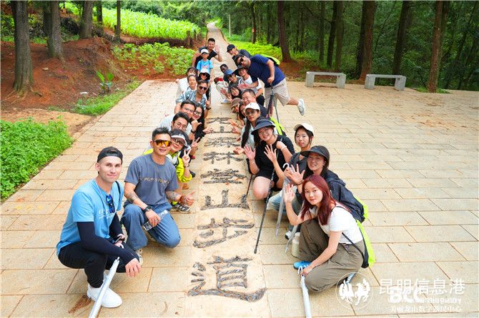 參加活動(dòng)的中外朋友在龍山森林登山步道字樣處合影。供圖