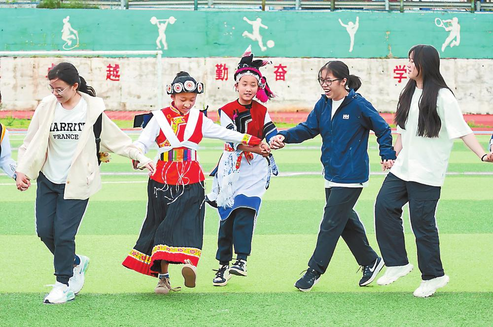 活動(dòng)中,澳門陳瑞祺永援中學(xué)學(xué)生向九河鄉(xiāng)中學(xué)的孩子們贈(zèng)送了書籍、文具等學(xué)習(xí)用品,兩地青少年學(xué)子互贈(zèng)祝??ê吞厣《Y物;澳門師生觀看了九河鄉(xiāng)中學(xué)學(xué)生表演的納西族勒巴舞和白族霸王鞭兩個(gè)非遺民族傳統(tǒng)節(jié)目,共跳《納西三部曲》,體驗(yàn)民族舞蹈特色和納西文化魅力。(云南日?qǐng)?bào) 記者李鐵成 通訊員楊強(qiáng)花)