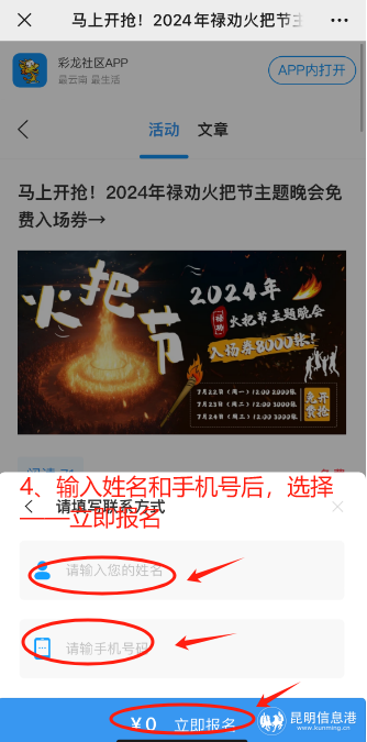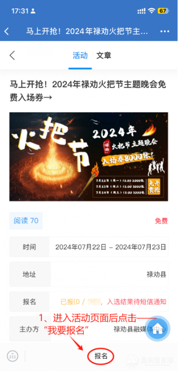 活動參與方式包括關(guān)注“魅力祿勸”微信公眾號,點擊菜單欄的“搶票”按鈕進入;或關(guān)注祿勸融媒APP或昆明信息港彩龍社區(qū),找到相關(guān)活動入口進入,隨后點擊“我要報名”即可。