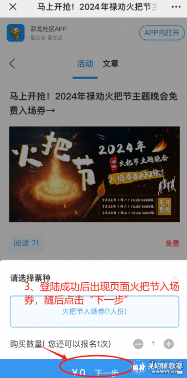 3、出現(xiàn)頁面火把節(jié)入場券,隨后點擊“下一步”