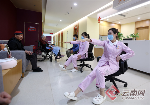 老人在古滇康養(yǎng)園跟著護(hù)士一起做操。陳飛 攝