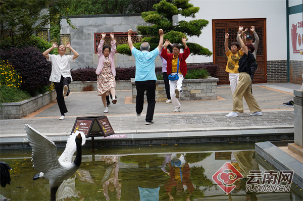 石林縣杏林大觀園的旅居老人在做養(yǎng)生操。供圖