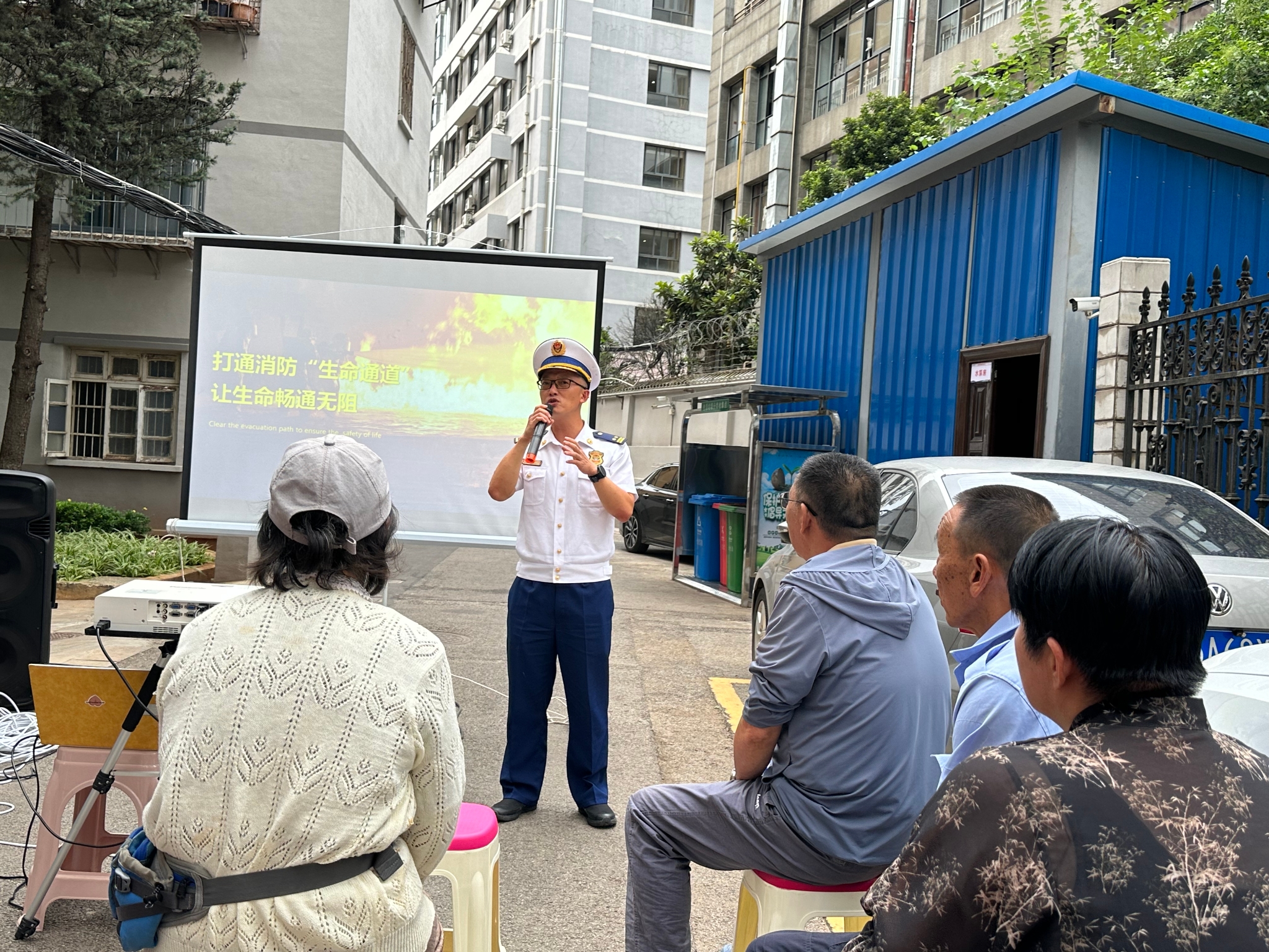 盤龍區(qū)消防救援大隊大隊長濮宇峰給附近居民介紹培訓內(nèi)容,邀請附近居民參加消防安全“院壩課堂”培訓。