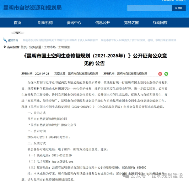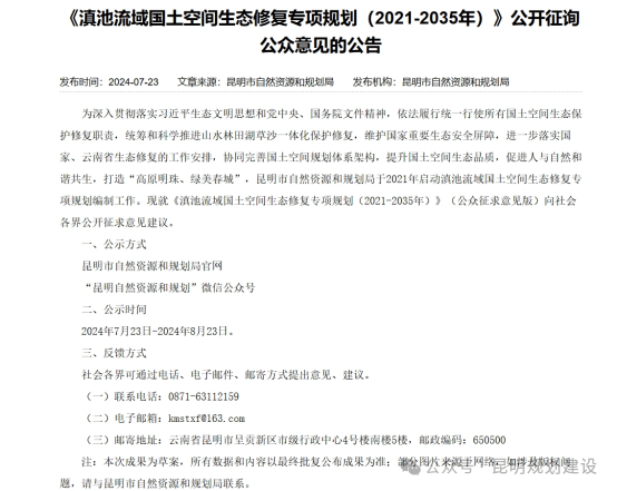 7月23日,昆明市自然資源和規(guī)劃局發(fā)布《昆明市國(guó)土空間生態(tài)修復(fù)規(guī)劃(2021—2035年)》《滇池流域國(guó)土空間生態(tài)修復(fù)專項(xiàng)規(guī)劃(2021—2035年)》公開(kāi)征詢公眾意見(jiàn)的公告。規(guī)劃明確了昆明市到2035年,國(guó)土空間生態(tài)修復(fù)和滇池流域國(guó)土空間生態(tài)修復(fù)過(guò)程中的總體目標(biāo)和總體布局,并對(duì)重點(diǎn)工程進(jìn)行安排部署。公示時(shí)間為7月23日至8月23日。