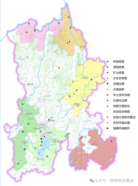 基于生態(tài)修復(fù)重點(diǎn)區(qū)域的資源環(huán)境特點(diǎn)及生態(tài)系統(tǒng)特征,昆明將著重解決主要生態(tài)環(huán)境問(wèn)題,同時(shí)落實(shí)國(guó)家和云南省對(duì)昆明市生態(tài)修復(fù)的工作任務(wù),共設(shè)定50項(xiàng)生態(tài)修復(fù)重大工程項(xiàng)目,涉及山水林田湖草各類生態(tài)系統(tǒng)的修復(fù)內(nèi)容。