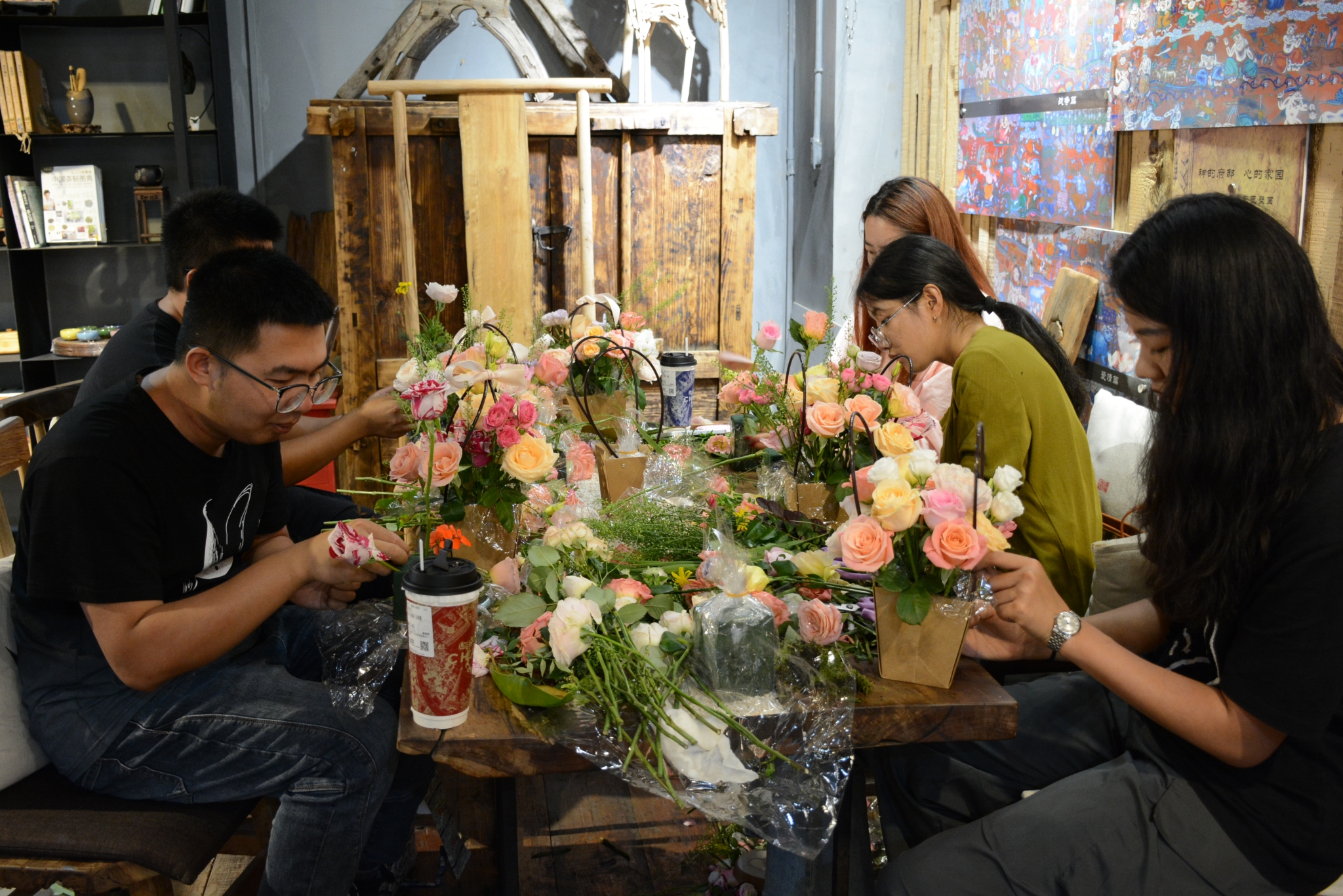 青年們用心創(chuàng)作屬于自己的插花作品。(段玉菊 攝)