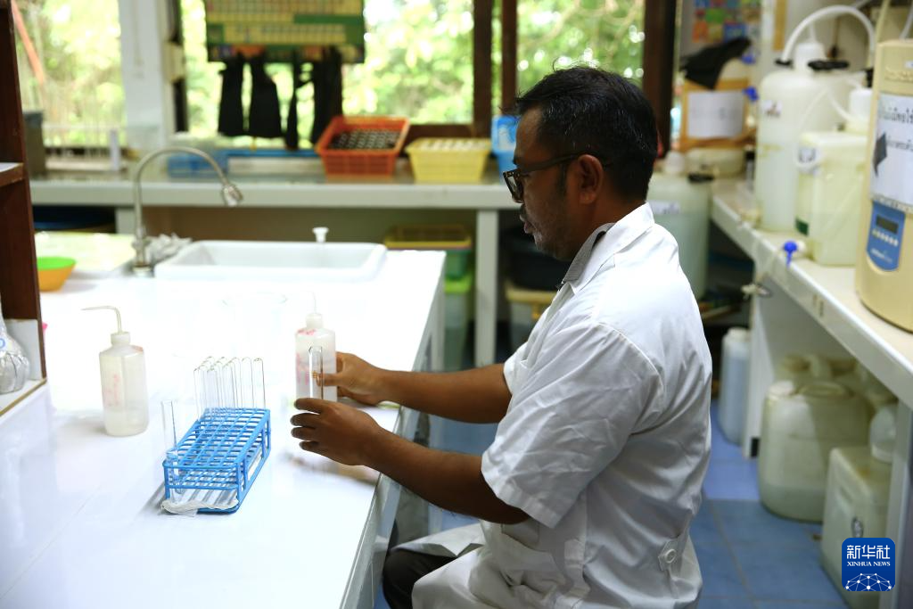 7月23日,在位于泰國普吉的中泰氣候與海洋生態(tài)系統(tǒng)聯(lián)合實驗室,工作人員進行水質(zhì)檢測。新華社記者 孫瑋彤 攝