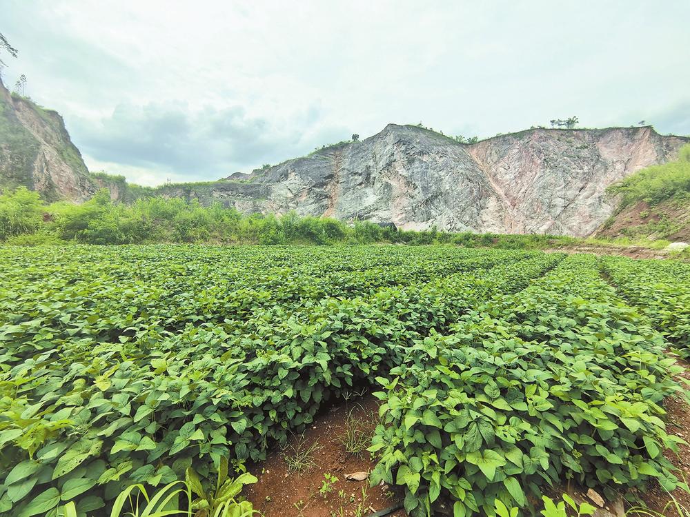仲夏時(shí)分,芒市芒里沙場(chǎng)礦區(qū)內(nèi),綠油油的大豆從山頂蔓延到山腳,抬眼望去,滿(mǎn)目蔥綠。