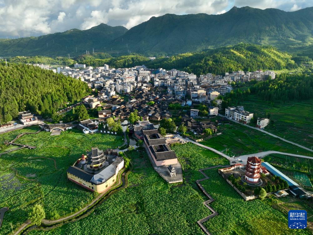 這是7月29日拍攝的浦源村百畝荷花塘及村內(nèi)古建筑群(無人機(jī)照片)。