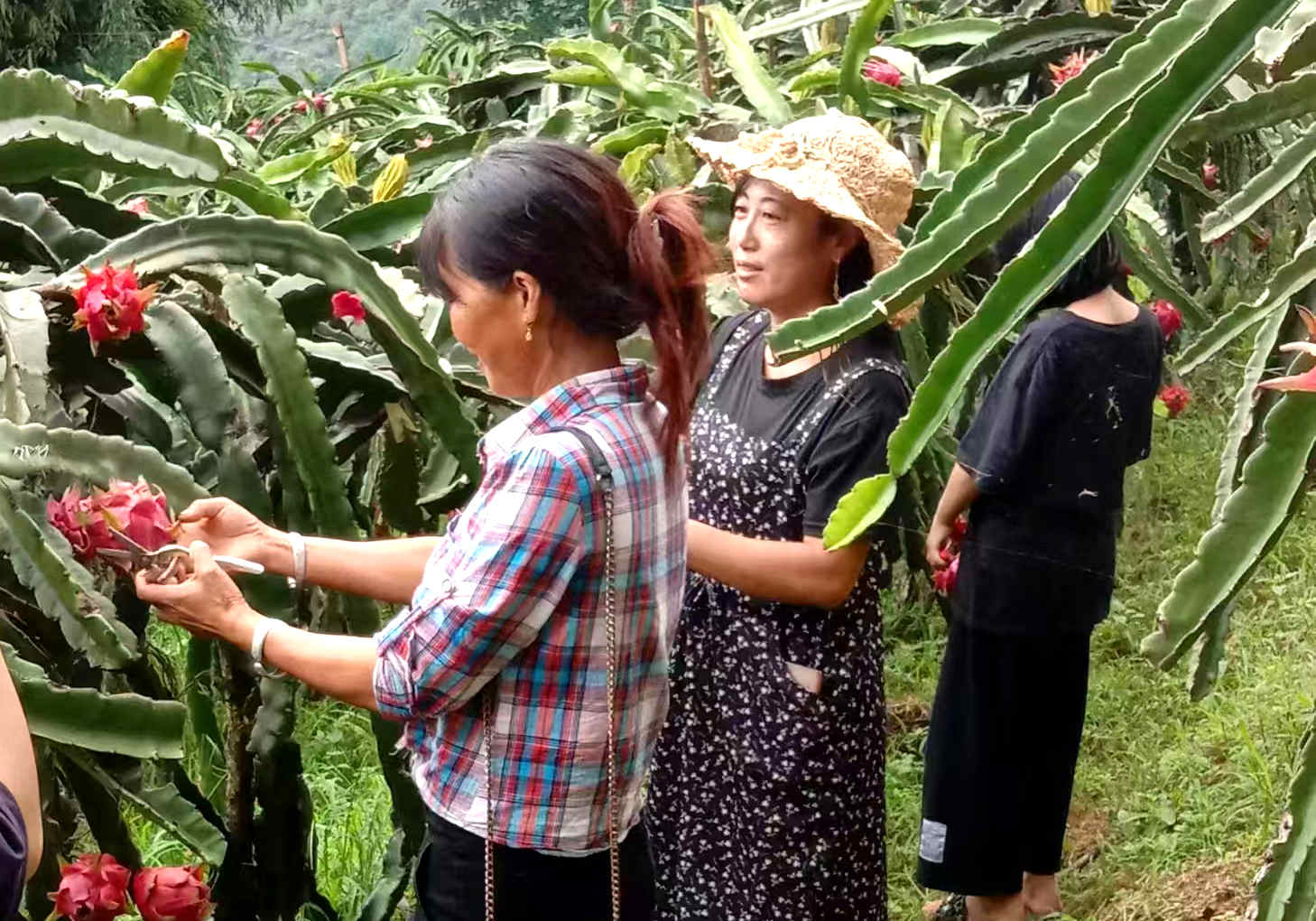 基地里,翠花夫妻倆正在忙著采摘火龍果。