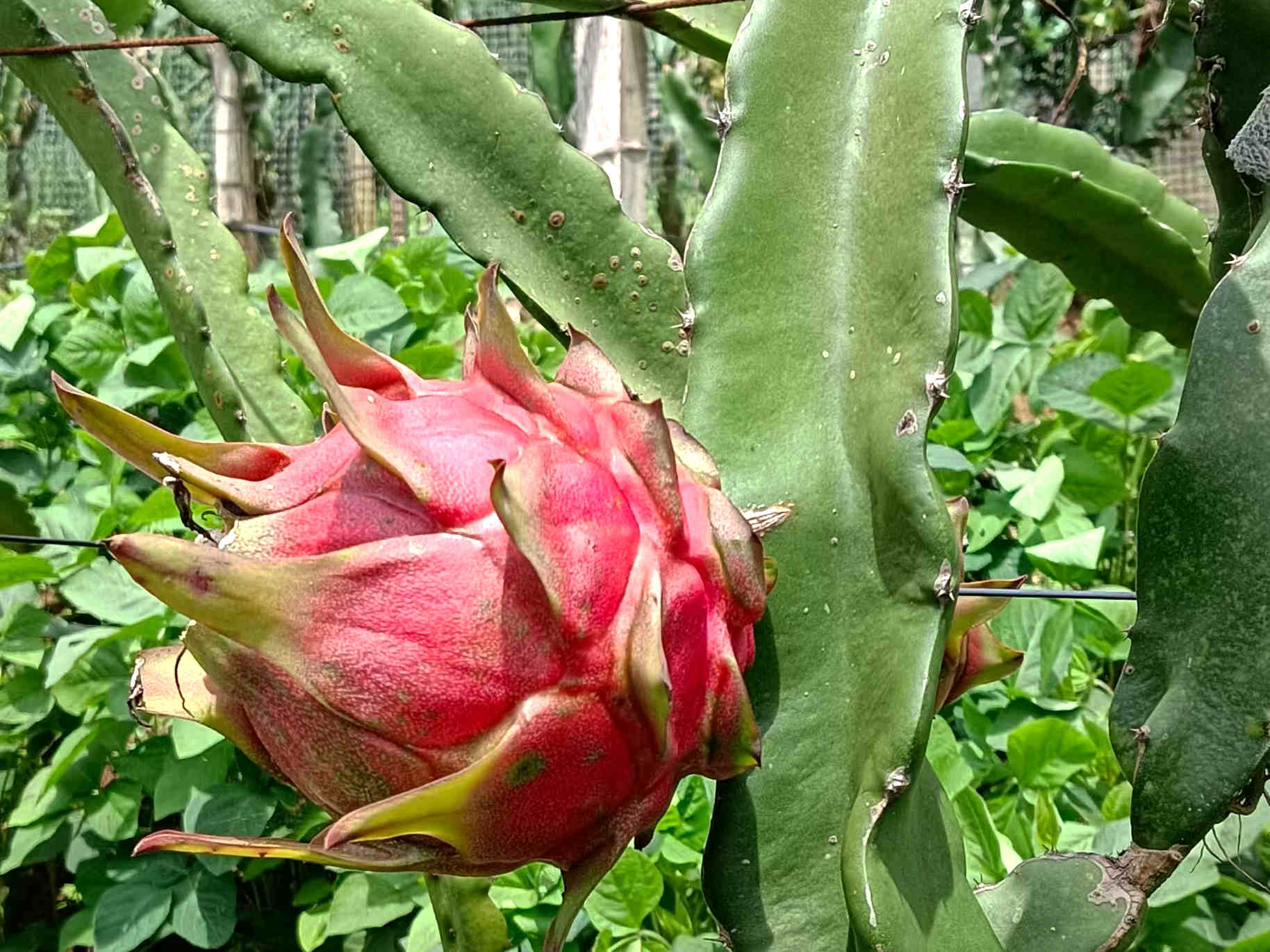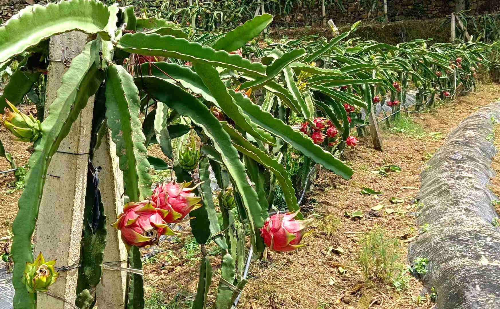 沿著蜿蜒的山路,不一會就來到了位于雅瑯河邊的火龍果種植基地。放眼望去,只見一排排火龍果在架子上整齊地排列著,仙人掌狀的藤蔓上,一個(gè)個(gè)怒放的“紅色火球”,色澤鮮艷、果形飽滿、長勢喜人,構(gòu)成了一幅誘人的風(fēng)景。