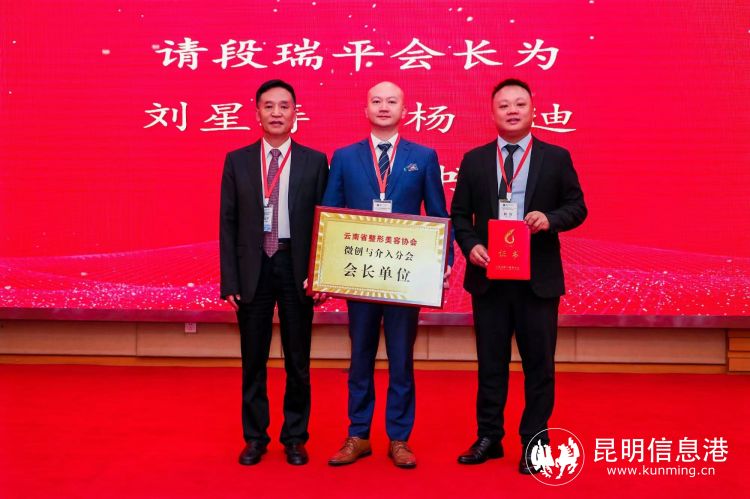 云南省整形美容協(xié)會(huì)段瑞平會(huì)長(zhǎng)為云南省整形美容協(xié)會(huì)微創(chuàng)與介入分會(huì)會(huì)長(zhǎng)單位——昆明新醫(yī)誠(chéng)醫(yī)院授牌,昆明新醫(yī)誠(chéng)醫(yī)院業(yè)務(wù)院長(zhǎng)劉星濤教授與總經(jīng)理?xiàng)畹瞎餐优啤?/p>