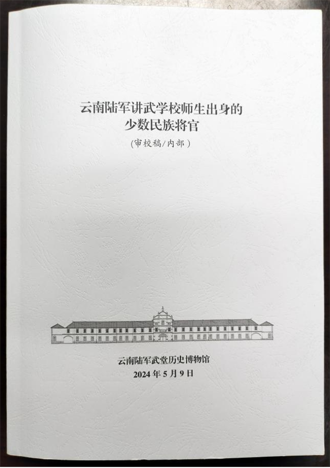 在上級主管單位昆明市文化和旅游局領導指導下,《云南陸軍講武學校師生出身的少數(shù)民族將官》研究課題于2019年正式立項,因受疫情影響,外出調(diào)研及相關資料查詢無法按研究計劃進行,加之史料散失嚴重,查找困難,為謹慎做好每一位少數(shù)民族將領考證,課題組成員在市文物局、市博物館的學術顧問指導下,進行多方面史料查找比對。通過對中國第二歷史檔案館、云南省檔案局(館)館內(nèi)現(xiàn)有同學錄和省、市文史資料及地方史志及當事人自述等進行多方查證,于2024年5月形成了19.9萬字的課題研究成果,研究成果共分六章、四個附錄,其中六章分別為:背景;云南陸軍講武學校的少數(shù)民族將官分析;云南陸軍講武學校的著名少數(shù)民族將官;抗日戰(zhàn)爭中的云南陸軍講武學校少數(shù)民族將官;解放戰(zhàn)爭中的云南陸軍講武學校少數(shù)民族將官;結論。四個附錄為:云南陸軍講武學校師生出身的少數(shù)民族將官履歷合集;云南陸軍講武學校師生出身的少數(shù)民族上校簡歷合集;課題研究階段性成果公開發(fā)表文章;云南陸軍講武學校師生出身的少數(shù)民族將官課題研究工作報告。