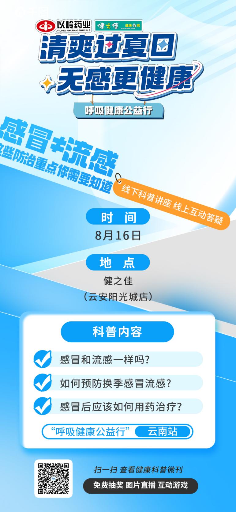 昆明信息港訊 記者上官艷君 立秋后,昆明天氣依舊“熱”力不減,早晚寒涼,中午炎熱,造成感冒流感多發(fā)。為解決群眾呼吸健康問題,以嶺藥業(yè)攜手云南健之佳共同開展的2024“呼吸健康公益行”活動將于8月16日在昆明健之佳健康藥房(云安陽光城店)舉辦。