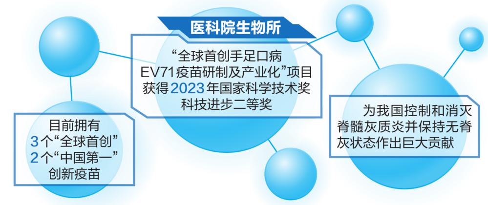 中國醫(yī)學科學院醫(yī)學生物學研究所研發(fā)的脊灰系列疫苗讓中國實現(xiàn)無脊髓灰質(zhì)炎目標,累計提供超60億劑次;甲肝系列疫苗有效控制中國甲型肝炎流行,累計提供超2億劑次;腸道病毒71型滅活疫苗為中國降低兒童手足口病流行、死亡病例作出重要貢獻……