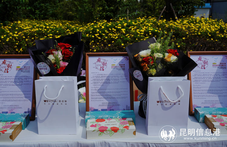 “這是我們的一點(diǎn)心意,希望您能喜歡?!惫ぷ魅藛T邊說邊遞上一束束鮮花。緊接著,一盒盒香甜的鮮花餅、松露餅干,以及實(shí)用的薇諾娜防曬霜也逐一送達(dá),讓主理人們感受到了來自昆明的熱情與關(guān)懷。