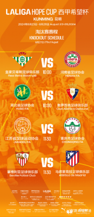 8 月 26日上午,第三屆西甲希望杯中國(昆明)賽小組賽全部結束,馬德里競技、皇家貝蒂斯、塞維利亞、奧薩蘇納、江蘇足球運動協(xié)會、重慶足協(xié)、河南足協(xié)、湖北足協(xié)等八支隊伍晉級淘汰賽。