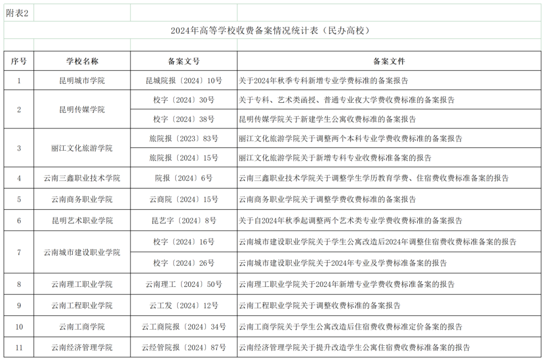 (一)學(xué)費(fèi)收費(fèi)備案學(xué)校:昆明城市學(xué)院、昆明傳媒學(xué)院、麗江文化旅游學(xué)院、云南三鑫職業(yè)技術(shù)學(xué)院、云南商務(wù)職業(yè)學(xué)院、昆明藝術(shù)職業(yè)學(xué)院、云南城市建設(shè)職業(yè)學(xué)院、云南理工職業(yè)學(xué)院、云南工程職業(yè)學(xué)院。