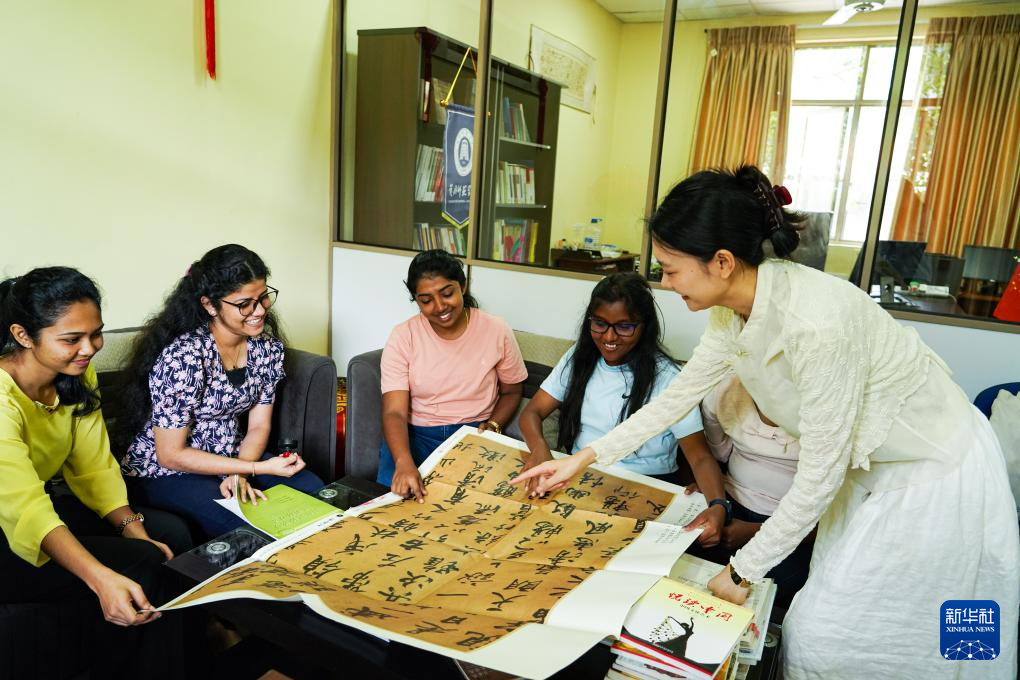 9月4日,在位于斯里蘭卡中央山脈南麓的薩伯勒格穆沃大學(xué),中國教師夏子涵(右)正在為孔子課堂漢語專業(yè)的學(xué)生們展示中國書法作品。新華社記者 陳冬書 攝