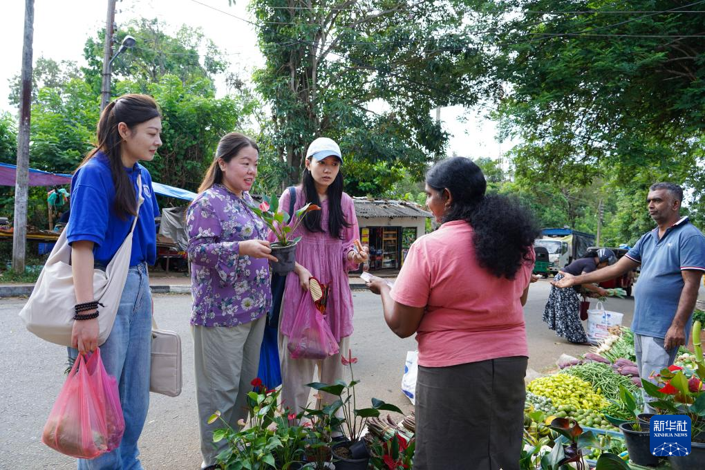 9月4日,斯里蘭卡薩伯勒格穆沃大學(xué)孔子課堂院長朱頌(左二)、教師夏子涵(左三)和張歡(左一)在學(xué)校附近每周一次的傳統(tǒng)集市上采購。新華社記者 陳冬書 攝