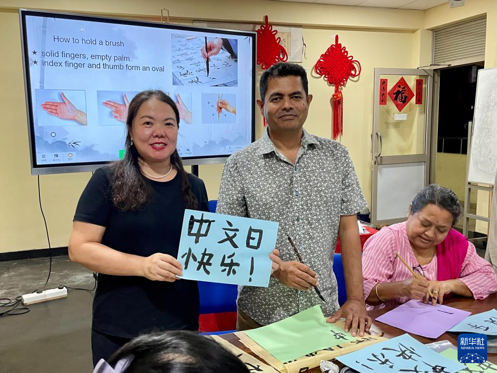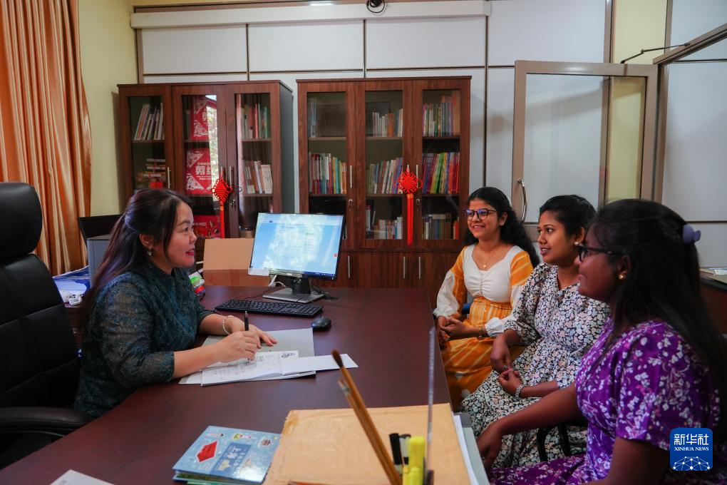 4月3日,在位于斯里蘭卡中央山脈南麓的薩伯勒格穆沃大學(xué),薩伯勒格穆沃大學(xué)孔子課堂院長朱頌(左)在“國際中文日”活動上與學(xué)校教職工漢語培訓(xùn)班的學(xué)員互動。新華社發(fā)(薩伯勒格穆沃大學(xué)孔子課堂供圖)