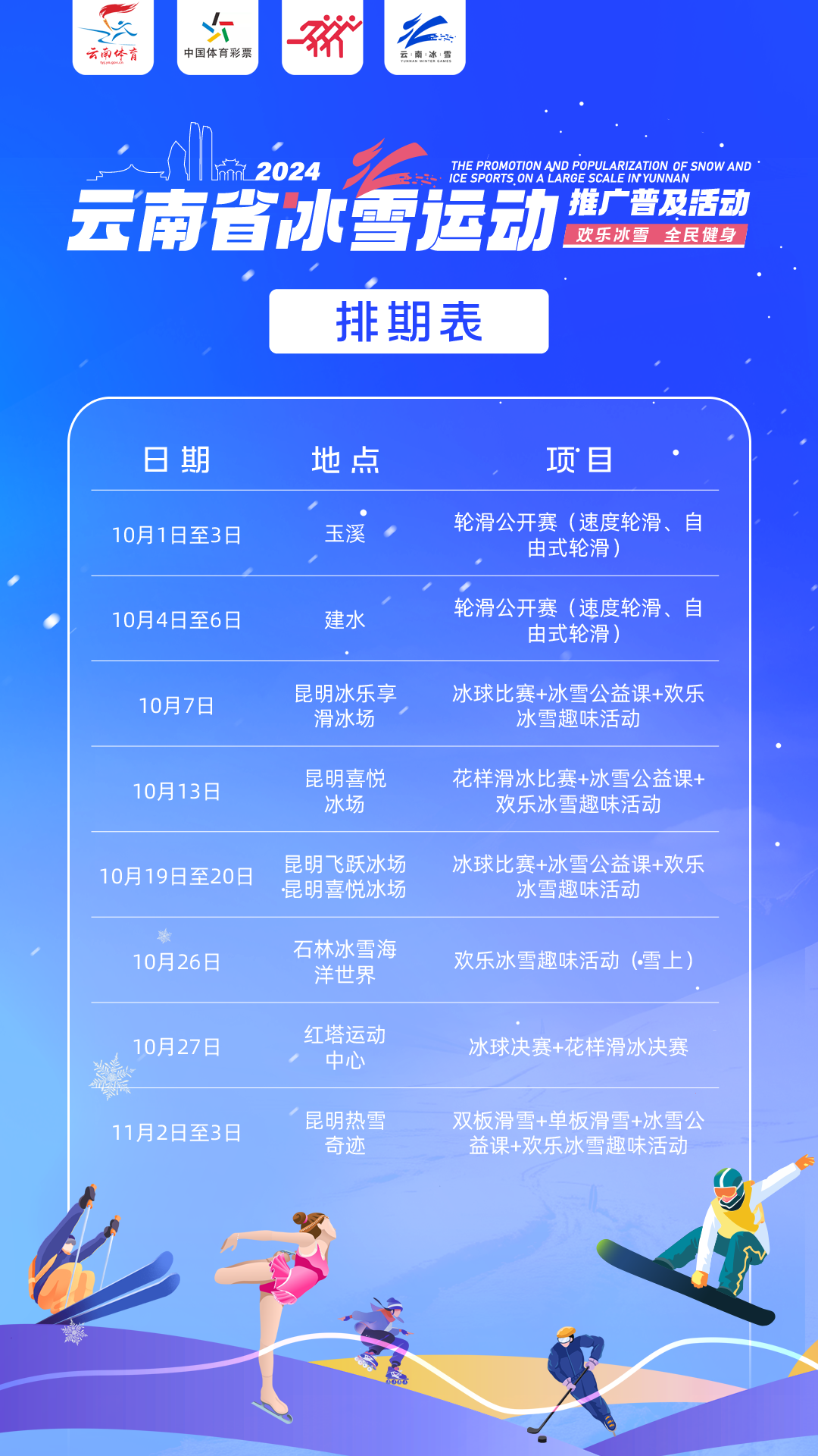 2024云南省冰雪運(yùn)動(dòng)推廣普及活動(dòng)將于10月拉開序幕,屆時(shí)將在昆明、玉溪、騰沖、建水、會(huì)澤等多個(gè)州市、縣區(qū)開展輪滑公開賽、歡樂冰雪趣味活動(dòng)、冰雪挑戰(zhàn)賽、冰雪進(jìn)校園、冰雪公益體驗(yàn)券發(fā)放等一系列主題活動(dòng),為廣大群眾帶來運(yùn)動(dòng)快樂的同時(shí),推動(dòng)全民健身和全民健康深度融合。